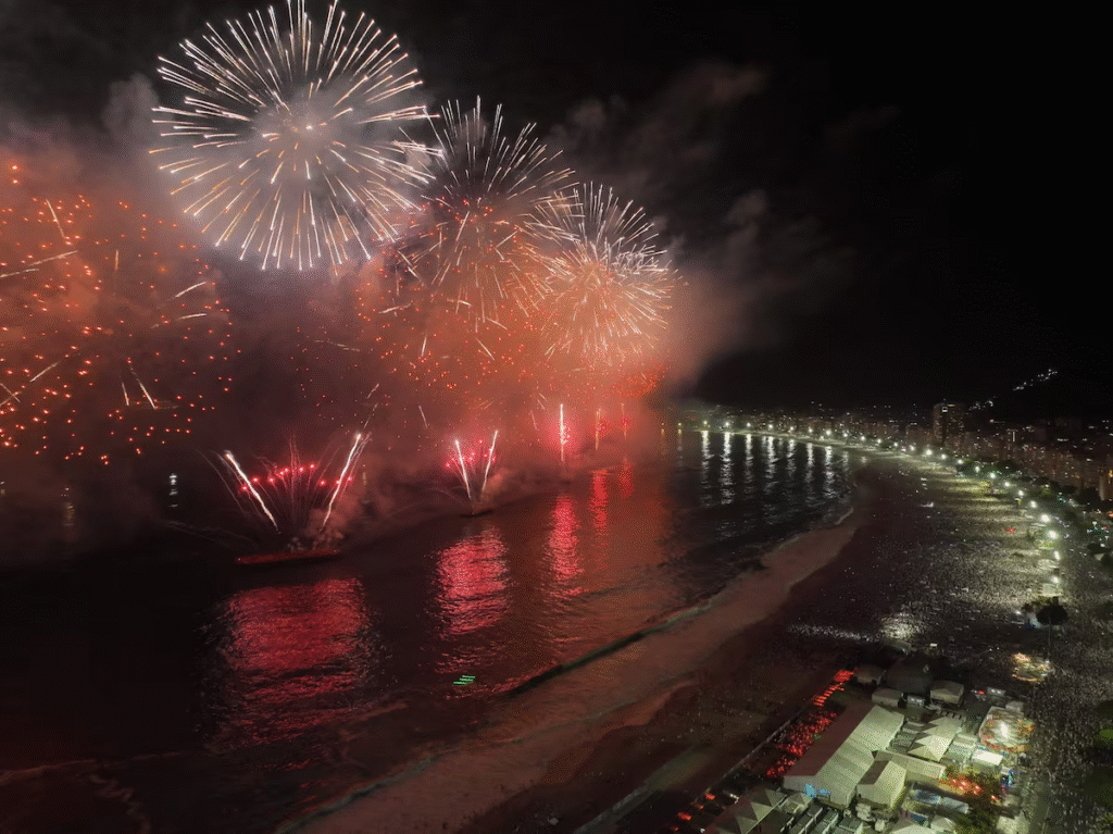 O tradicional espetáculo de fogos de artifício, marca registrada da virada carioca, completa o cenário que mistura música, fé, diversidade cultural e emoção coletiva à beira-mar.